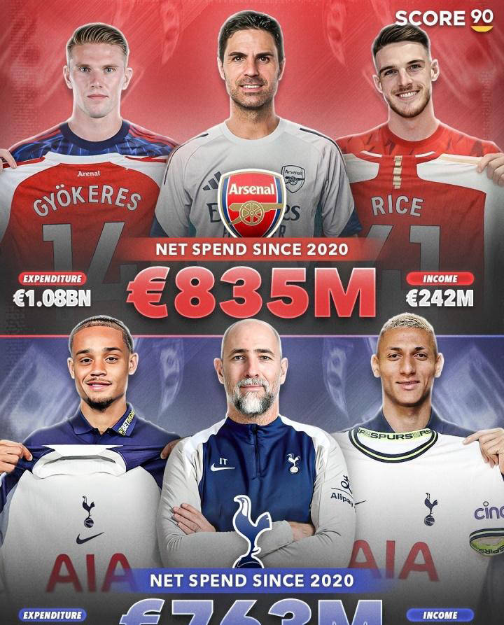 根据足球数据平台Score90的统计,自2020年以来,阿森纳在转会市场的总投入达到10.8亿欧元,而收入2.42亿欧元,净投入约8.35亿欧元;热刺同期花费11.1亿欧元,收回3.46亿欧元,净支出7.63亿欧元。换句话说,过去五年两队在引援上的总投入几乎差不多,实际上热刺还高出了约3000万欧元。不过,令人意外的是,热刺阵容反而日益走下坡路,连续两个赛季联赛排名靠后。若非去年拿下欧联杯冠军,恐怕连欧冠席位都难以守住。